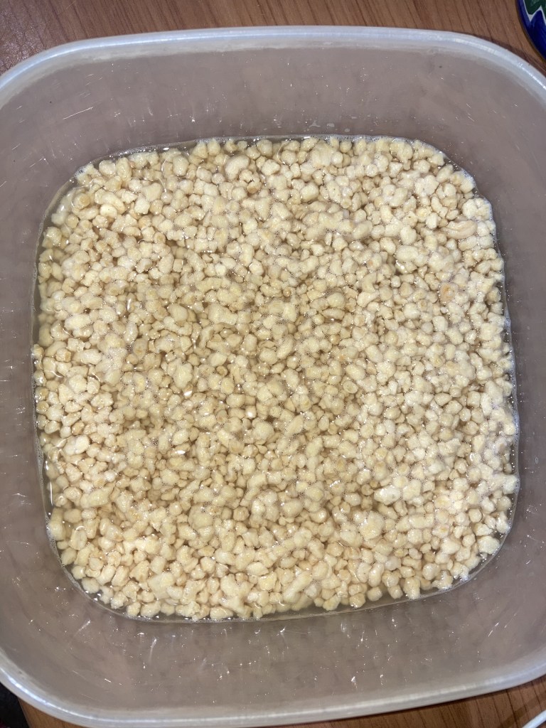 - Partiamo con il mettere in ammollo in acqua il granulare di soia per circa 5-10 minuti. Deve reidratarsi perfettamente e per farlo crescerà di volume, quindi assicuriamoci di usare un contenitore sufficientemente capiente.