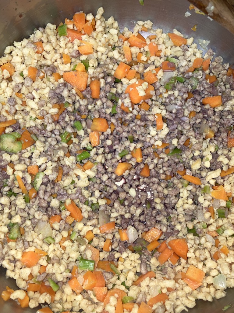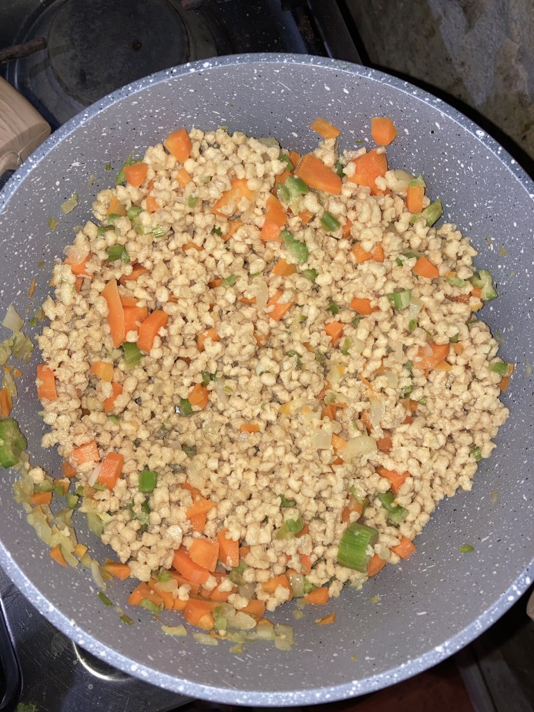 3. Attendiamo che il soffritto si scaldi (ci vorranno circa 5 minuti, durante i quali possiamo aggiungere un pochino di acqua) e aggiungiamo il granulare di soia dopo averlo scolato e strizzato dell’acqua che non è stata assorbita. Lasciamo insaporire per altri 5 minuti.