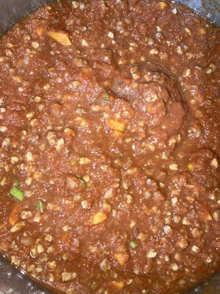 INGREDIENTI PER 10 PERSONE: 150 gr di granulare di soia (o macinato di soia), una carota, una costa di sedano, mezza cipolla, 600 ml di passata di pomodoro, mezzo bicchiere di vino rosso, sale, pepe, olio.